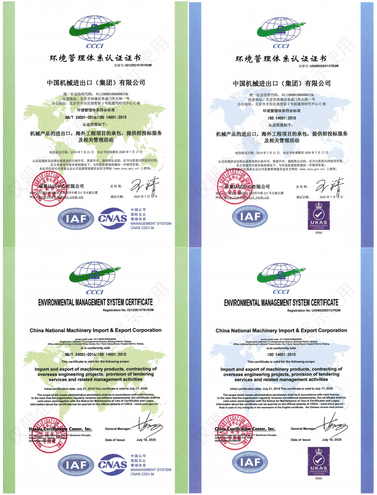 中机公司于2010年建立、实施ISO14001环境管理体系,并通过SGS第三方认证。每年对环境影响因素进行识别,并制定方案对因素进行管理;建立“环境管理法律法规库”和“环境管理体系网站”;通过每年更新环境法规库和展开合规性评价,供内部员工查阅公司有关环境政策、方针和业绩内容;通过合同评审,进行环境风险控制;通过环境管理体系的日常检查、内外部审核、管理评审及季度与年度考核机制,加强监督,对存在的不足通过履行纠正和预防措施不断加以完善,以持续改进环境绩效;通过内审员培训等将环境保护相关内容纳入每年的培训计划和临时培训计划,通过委托外部培训、公司组织培训和业务自学等形式,将培训计划落到实处。