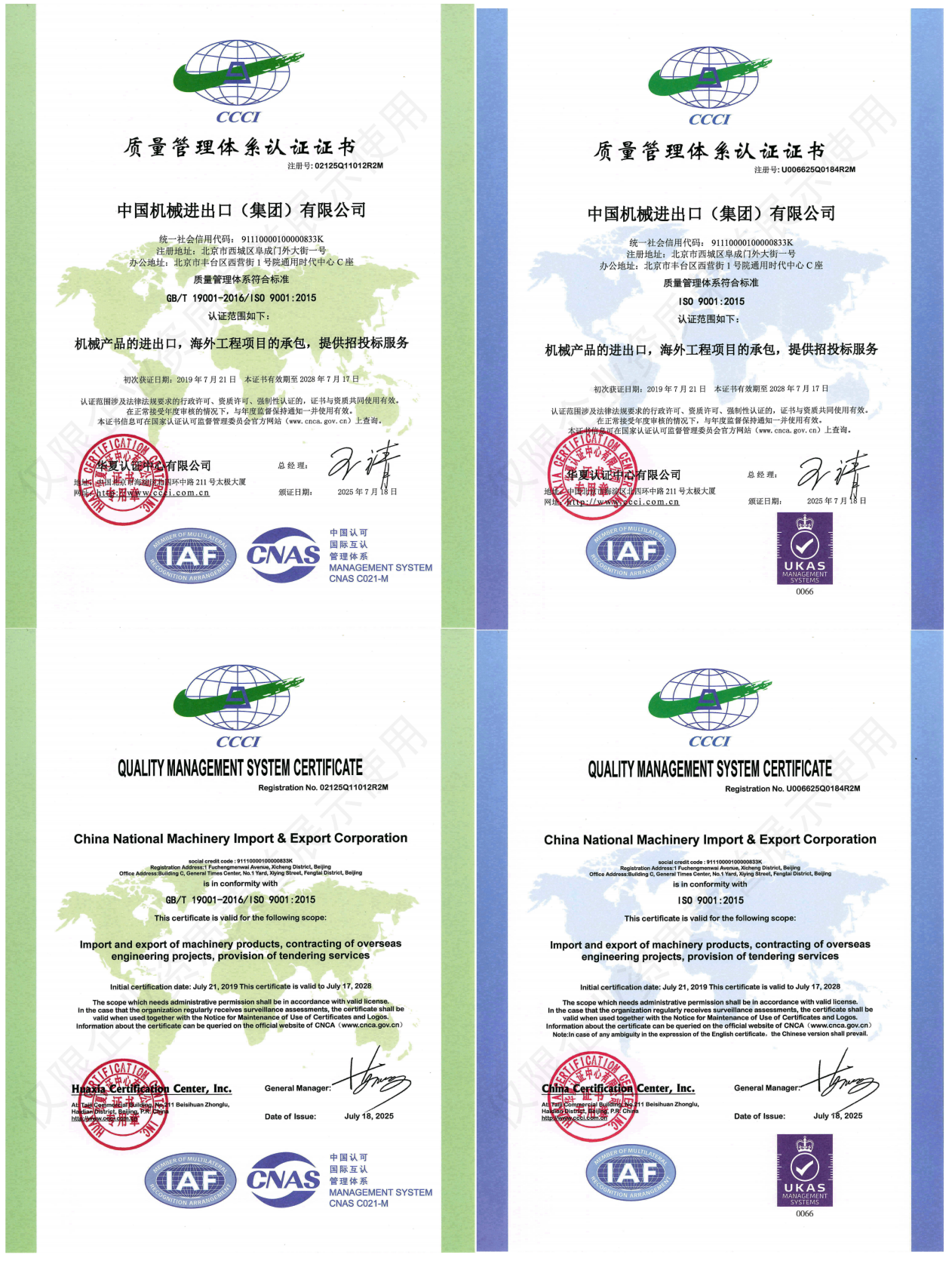 经过六十多年的辉煌,始终把客户放在第一位的中机公司,针对国际工程承包、国际贸易等业务,自2001年建立、实施并保持ISO9001质量管理体系,通过了SGS的第三方认证。公司始终秉持“客户至上,诚信经营,创造价值,精益求精”的质量方针,致力于为客户提供高品质的产品和服务,积极响应国内和国际标准,通过持续改进和不断创新,将追求客户100%的满意率,及股东、员工、社会、合作伙伴等相关方高满意率,实现公司持续稳定发展的经营理念贯穿于公司经营管理活动的全过程,持续改进质量管理流程,不断完善质量管理体系。